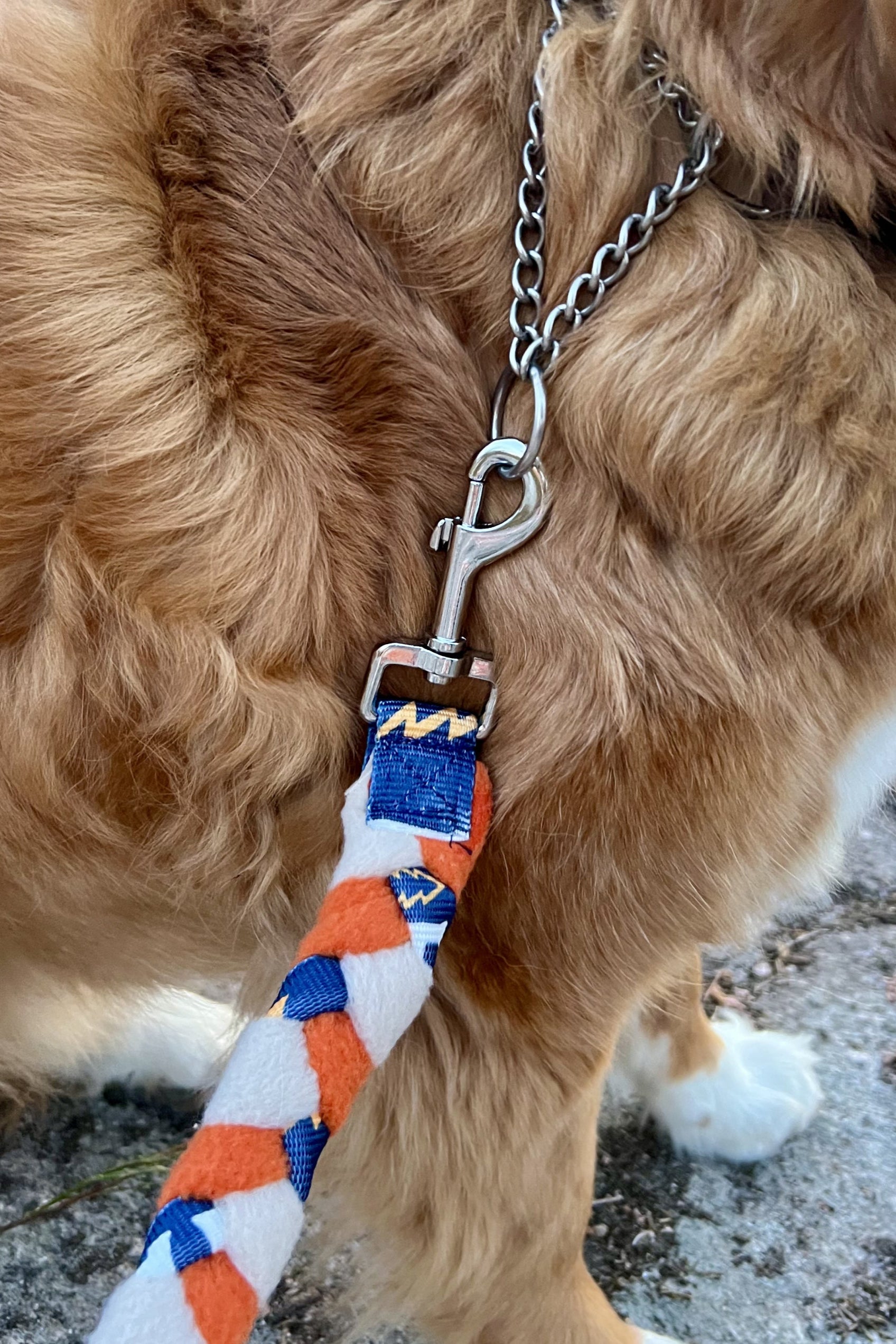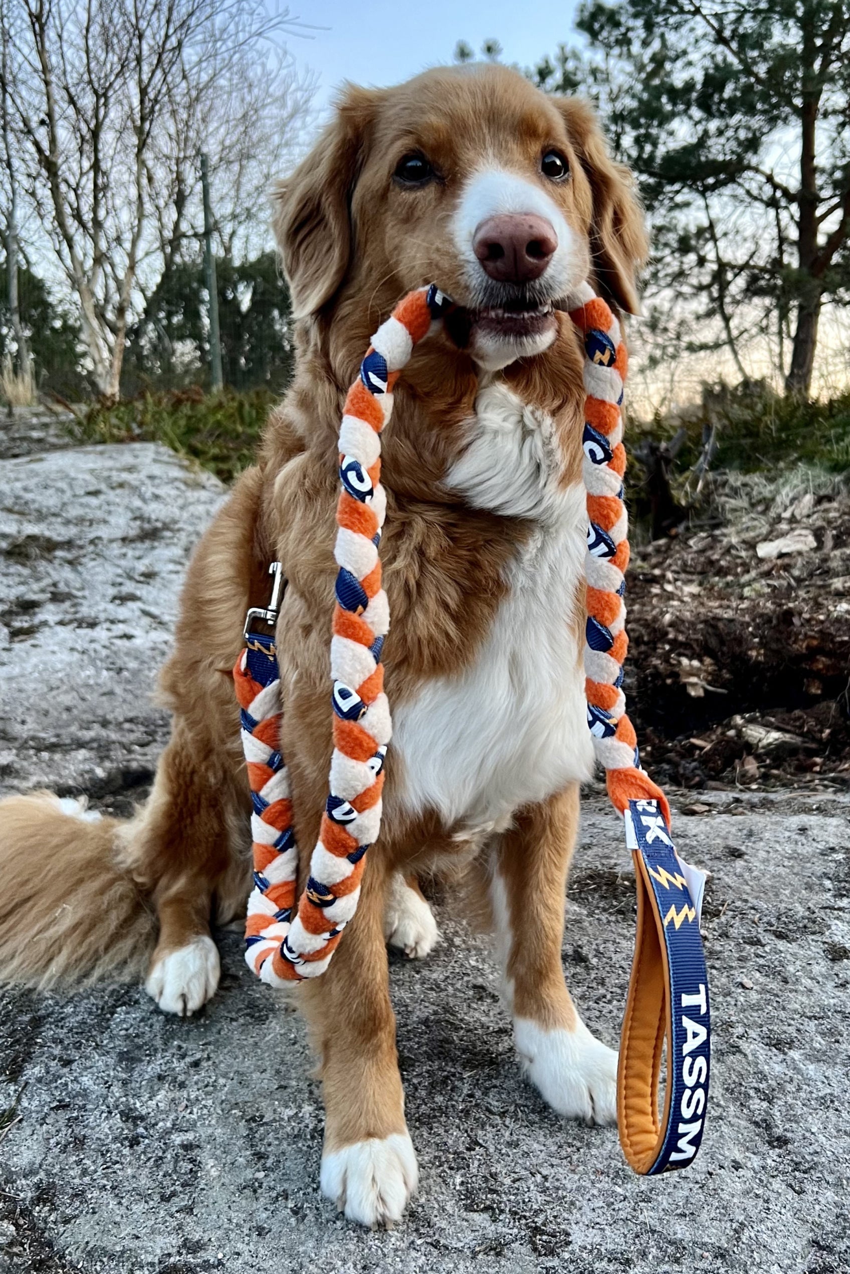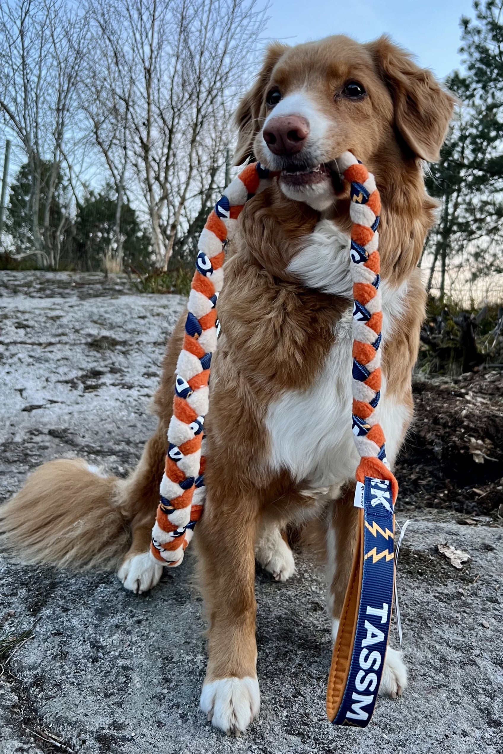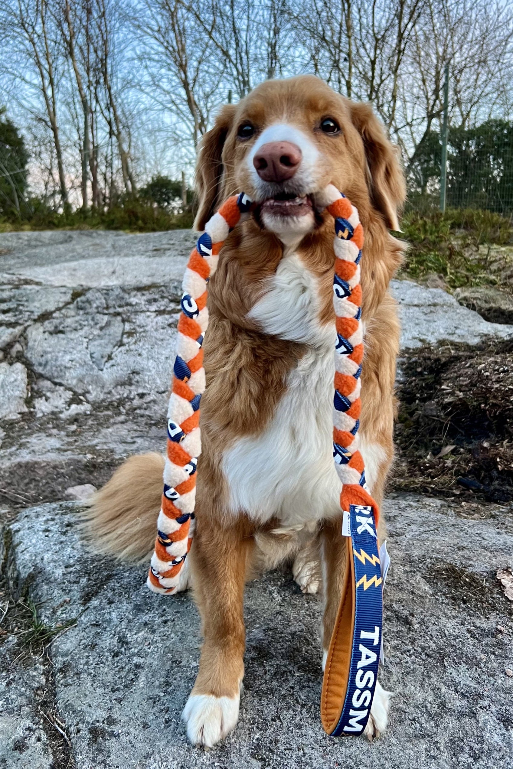 Kopplet är flätat av fleece och tubväv – mjukt mot hundens mun men ändå slitstarkt nog för riktiga dragkamper. Handtaget är fodrat med softshell så det ligger skönt i handen även om din hund går in för kampen med full kraft (och ja, du slipper brännmärken på fingrarna).