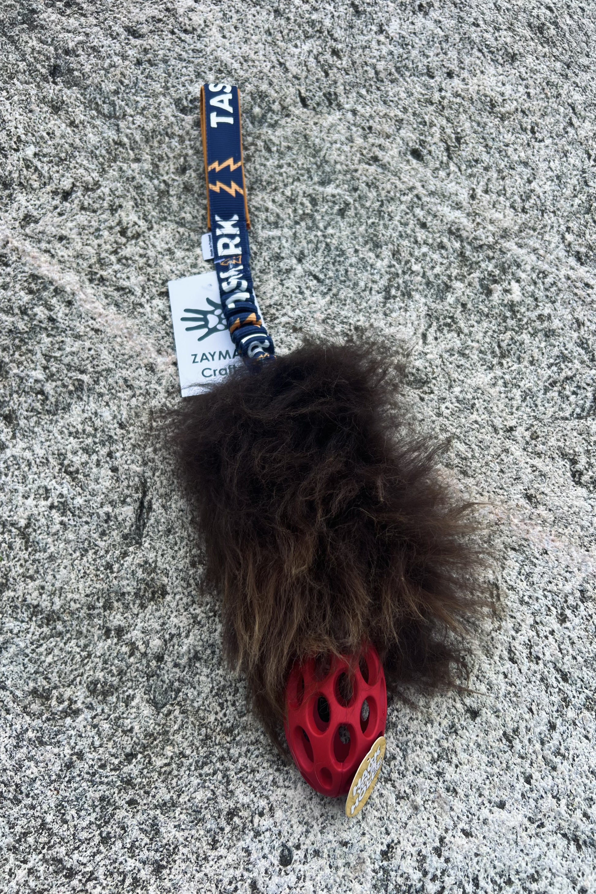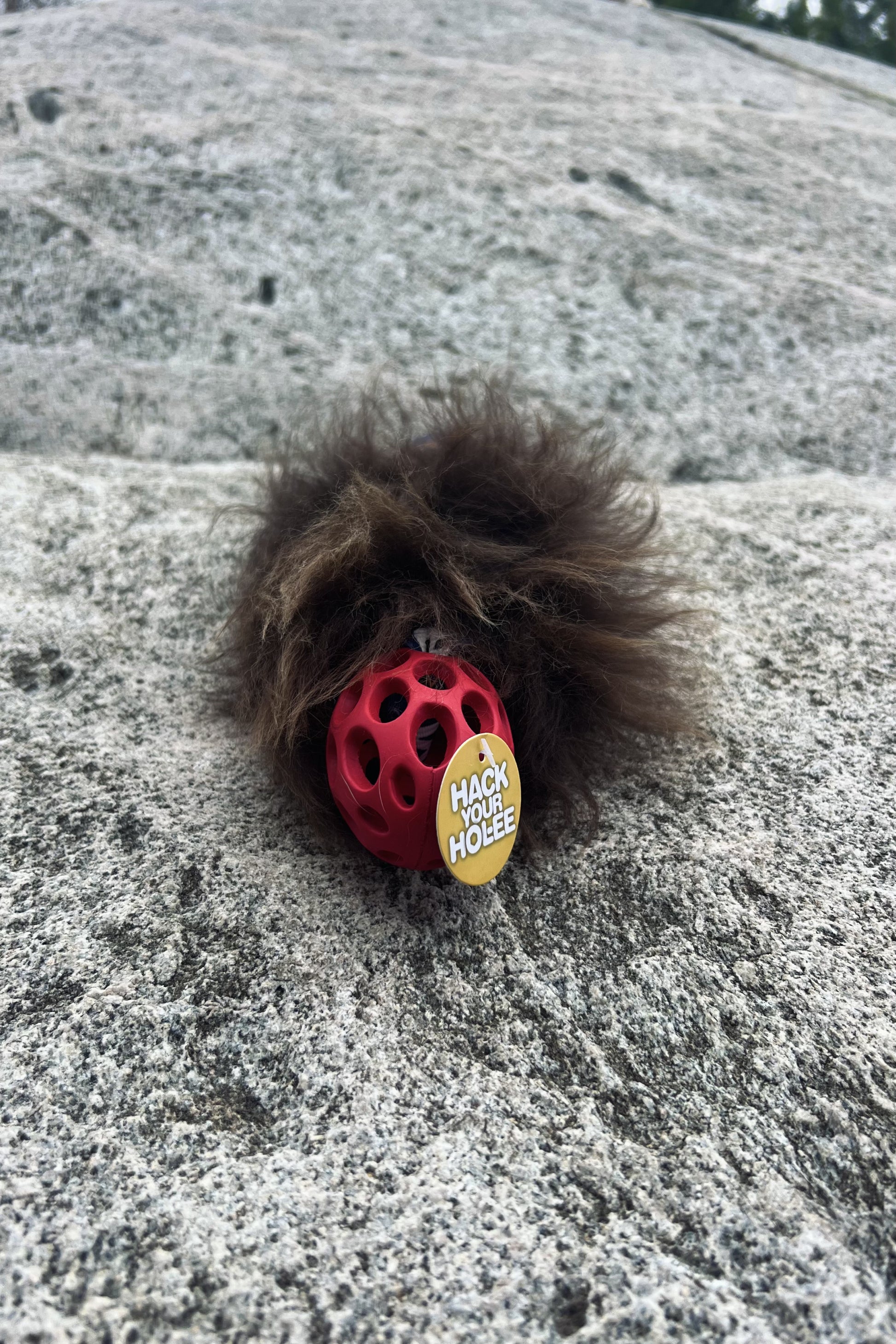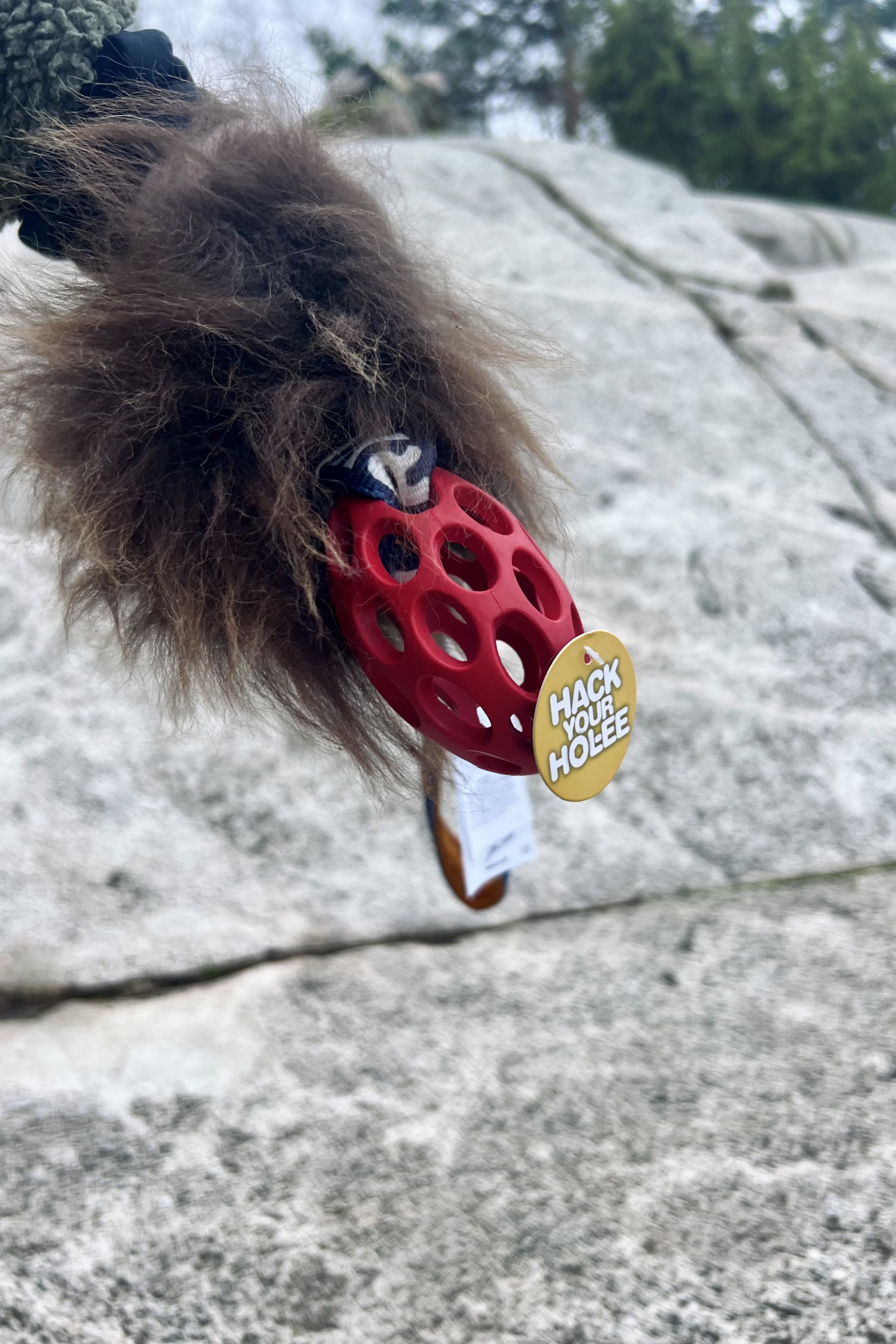 En riktigt härlig kampleksak i brunt äkta fårskinn – mjuk, hållbar och full av känsla. Med en röd Hol-EE Football i storlek S i ena änden och bungee med handtag för skönare kamp.