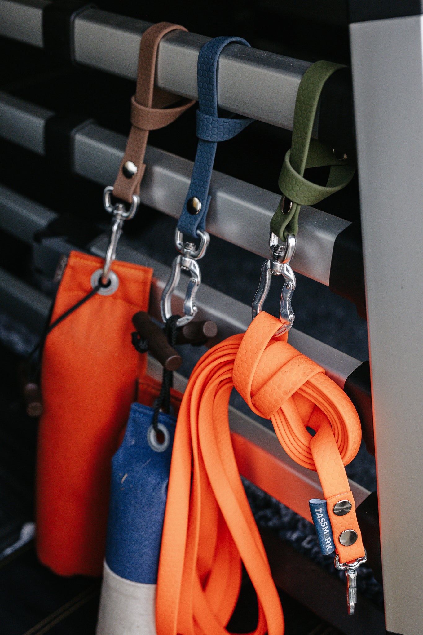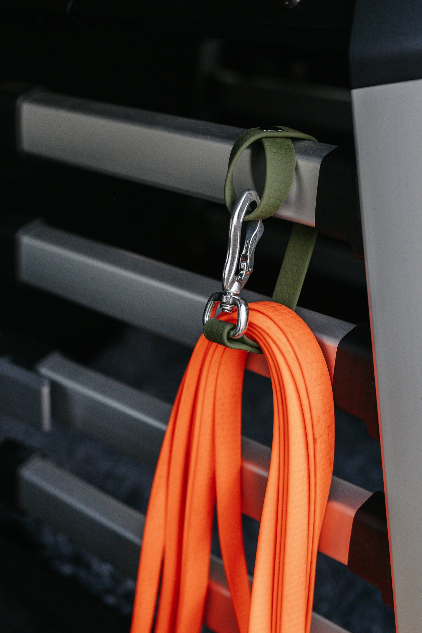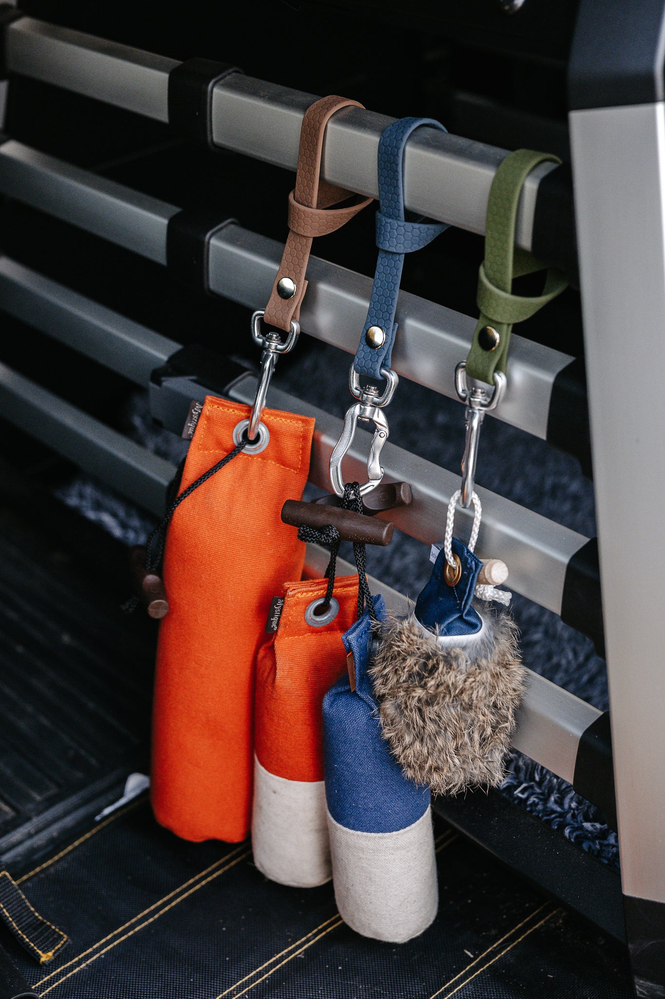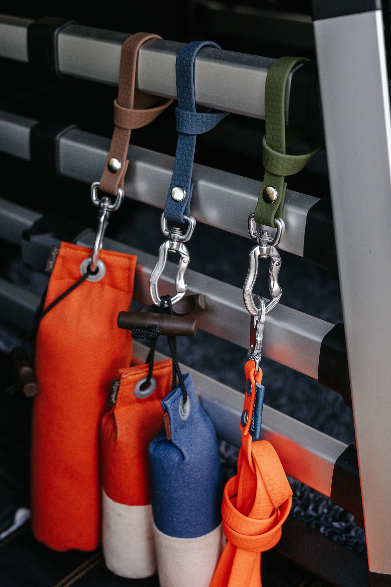 Använd den som hållare för spårlinor, koppel, dummies eller annan utrustning – i bilen, på bältet eller på träningsväskan.